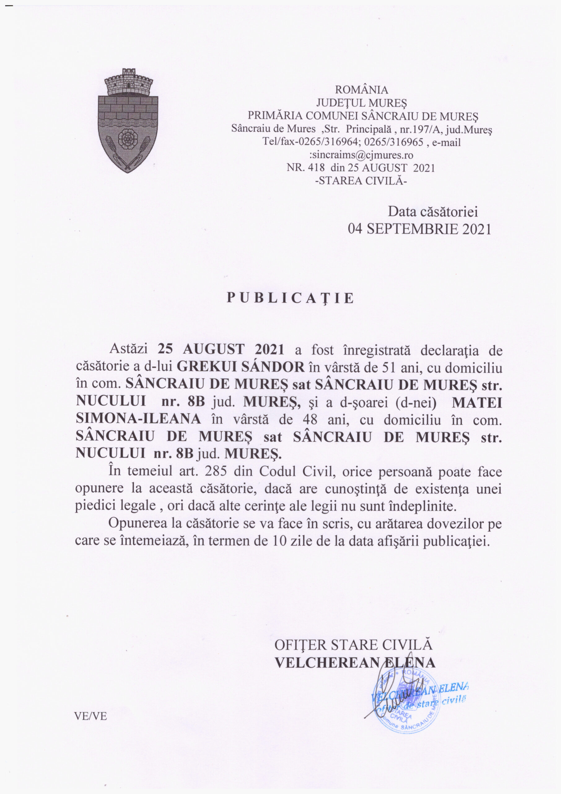 Publicatie de casatorie Grekui Sandor cu Matei Simona Publicatie de casatorie Grekui Sandor cu Matei Simona